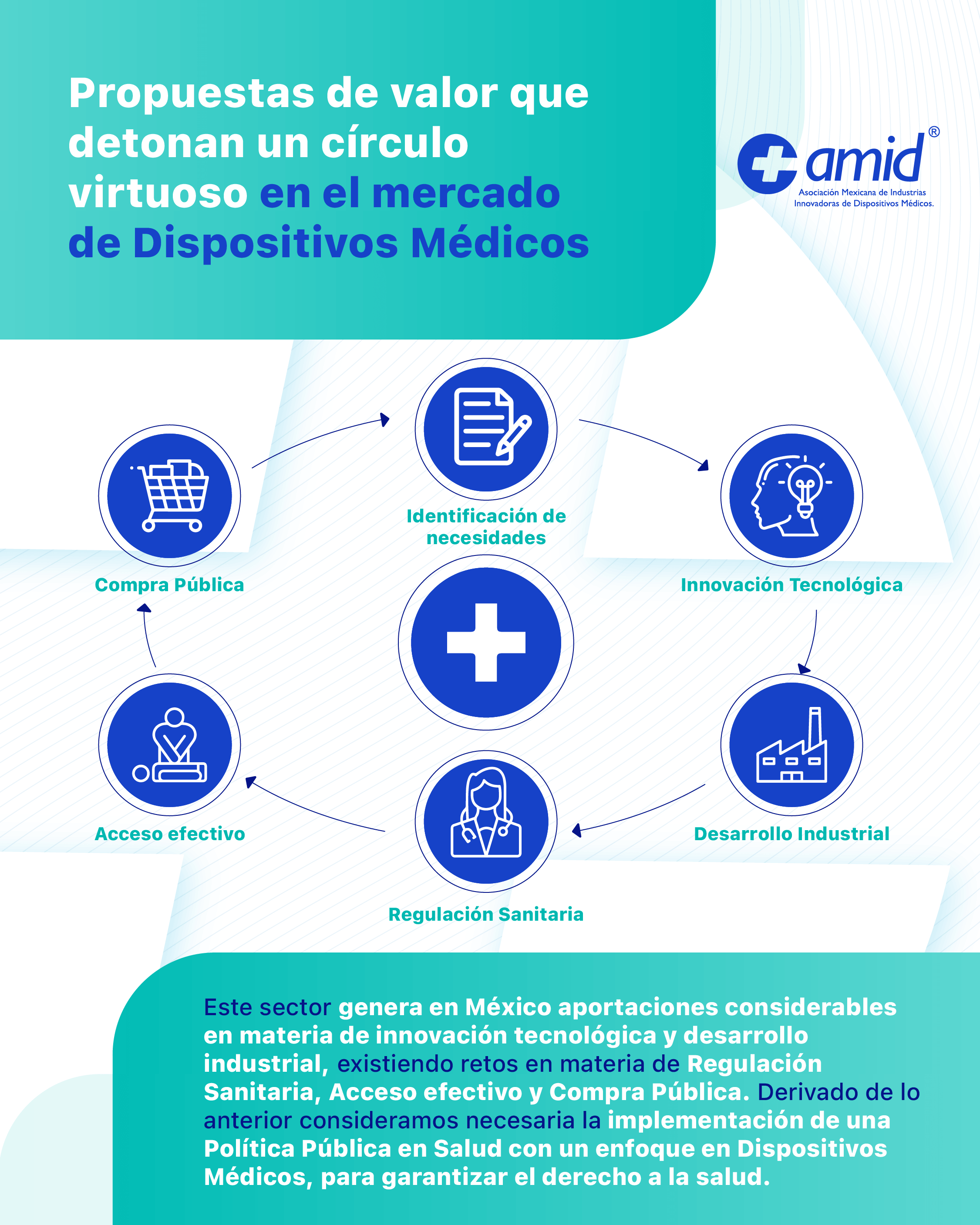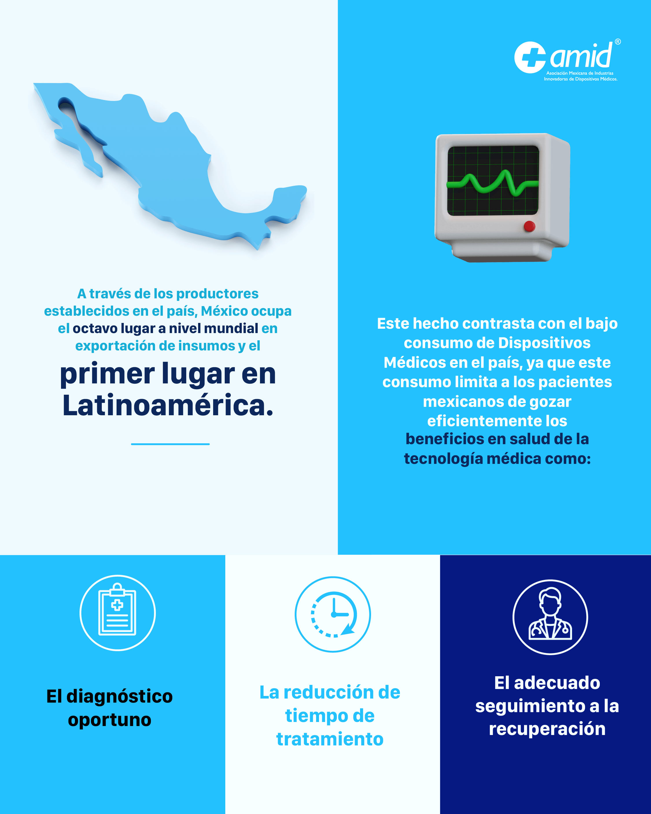 Los miembros de AMID ofrecemos innovación en dispositivos médicos y sistemas de diagnóstico para atender más de 75 especialidades médicas. Servimos a instituciones de salud públicas y privadas, hospitales, laboratorios y clínicas; así como a instituciones de investigación y al público en general.